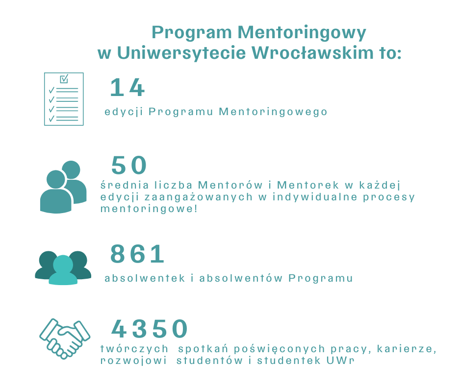 W minionym roku akademickim procesów mentoringowych doświadczyło 126 studentek i studentów Uniwersytetu Wrocławskiego z różnych kierunków od humanistycznych, przez społeczne, przyrodnicze do ścisłych. Nasz Program Mentoringowy jest jednym z największych w polskich uczelniach.